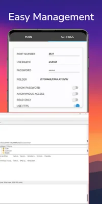 Managing your files with FTP Fast Server is effortless and intuitive. The application offers easy management through features such as directory browsing, file uploads and downloads, and more. This allows you to easily organize and access your files, making file management a breeze.