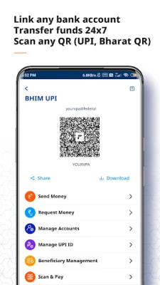 The app also allows for real-time online payments and fund transfers using various methods such as UPI, IMPS, NEFT, and RTGS. It also integrates with BHIM UPI, providing access to a full range of UPI services.