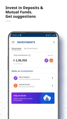 In addition to traditional banking services, the app also offers investment options such as mutual funds, gold, and the bank's deposit schemes. The "Help Me decide" feature helps users choose the best investment option for their needs.