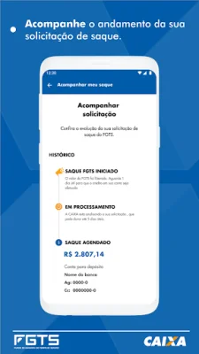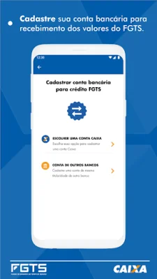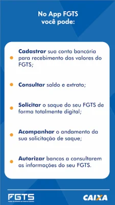 Para facilitar ainda mais o acesso ao FGTS, o aplicativo permite o cadastramento de contas da Caixa ou de outros bancos, para que o valor do saque seja depositado diretamente na conta escolhida pelo usuário. Também é possível autorizar a consulta às informações do FGTS por instituições financeiras e atualizar o endereço cadastrado.