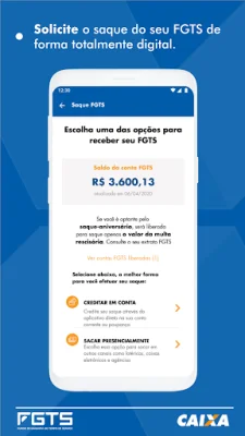 O aplicativo também oferece diversas funcionalidades, como a consulta ao saldo e extrato das contas FGTS, a opção de escolher entre o Saque-rescisão ou Saque-aniversário, e o Saque Digital para os motivos de saque rescisão e aposentadoria. Além disso, é possível solicitar saques para outros motivos, enviando os documentos necessários pelo próprio aplicativo.