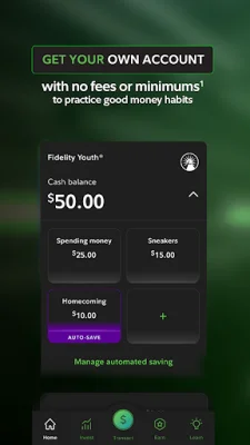 The "Invest" feature of Fidelity Youth® encourages teens to start investing early and put their money to work. The app's learning center provides tools and tips to educate teens about investing, and they can start investing with as little as $1. This feature also offers the only investment account that teens can own themselves, giving them a sense of ownership and control over their finances.
