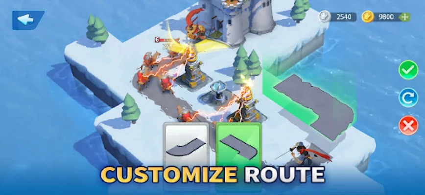 As you expand your territory, you must also build roads to control the enemy's path to the castle. Road cards can be used to manipulate the terrain and give you an advantage in battle. Remember, the longer the enemy's path within your tower's range, the higher your chances of success.