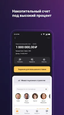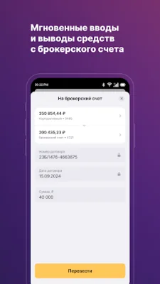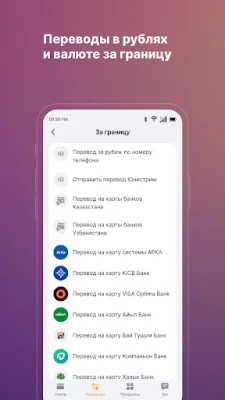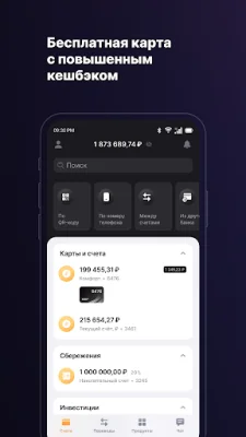 The "Платежи и переводы" (Payments and transfers) section of the app offers convenient and quick ways to manage your finances. You can easily top up your brokerage accounts with Finam in just a few clicks. The app also allows you to make fast payments for various services such as mobile, internet, utilities, and more. You can also transfer money from one card to another and create templates for regular payments. Additionally, the app is connected to the "Система Быстрых Платежей" (Fast Payment System), which enables you to transfer funds to other banks in Russia using just a mobile phone number.