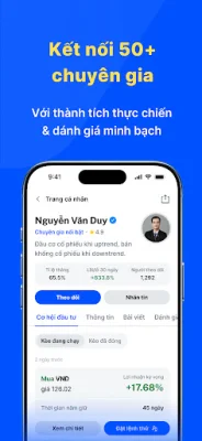 Finpath cũng kết nối người dùng với các chuyên gia uy tín và minh bạch về hiệu suất đầu tư. Người dùng có thể tiếp cận danh sách các chuyên gia đã được kiểm duyệt, có lịch sử tư vấn rõ ràng và được đánh giá bởi cộng đồng người dùng. Họ có thể lựa chọn theo dõi, hỏi đáp và đồng hành cùng chuyên gia phù hợp với phong cách đầu tư của mình.
