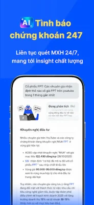 Ứng dụng này sử dụng công nghệ AI để hỗ trợ phân tích thị trường và cảnh báo thời điểm mua/bán. AI sẽ theo dõi thị trường 24/7 và phát hiện các dấu hiệu bất thường về dòng tiền, khối lượng giao dịch và biến động giá. Khi có cơ hội đầu tư, người dùng sẽ nhận được thông báo ngay lập tức để có thể hành động kịp thời.
