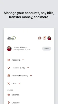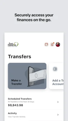 The app also offers features for managing your finances, such as setting savings goals, viewing budgeting summaries, and managing external accounts and balances. You can also set up account eAlerts for reminders and fraud protection, and use secure messaging to contact First Financial support.