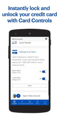 In addition, the app allows you to have control over your debit and credit cards by giving you the ability to turn them on or off. You can also deposit checks using Mobile Deposit, transfer funds between eligible accounts, and pay bills or cancel payments. With Zelle®, you can easily send, request, and split money with family, friends, and trusted individuals using your personal bank account. You can even move money between all of your personal bank accounts, including those at other banks.