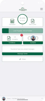 The First State Bank Mortgage app is a convenient tool for all parties involved in the home loan application process. It allows the home buyer, loan officer, and real estate agent to easily track the progress of the application as the home buyer meets the necessary milestones and conditions for final approval. This app streamlines the process and keeps everyone informed and on the same page.