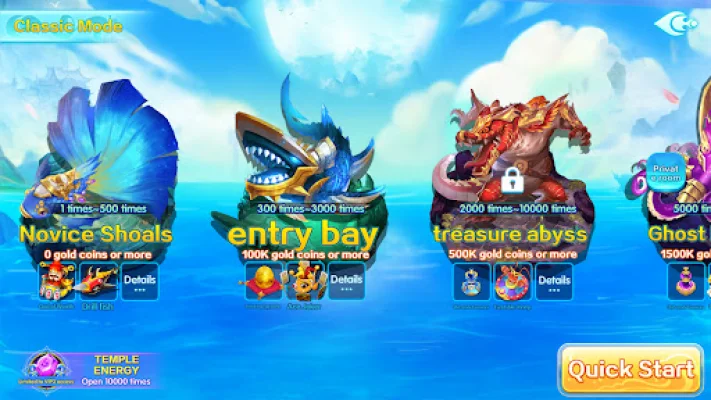 The "Fishing Shooting Game" is an exciting and visually stunning game that combines traditional fish shooting arcade gameplay with Xianxia elements. Players can catch various sea kings in the fishing ground while also challenging classic arcade gameplay in the arcade room. The game features a variety of rich and immersive scenes, including Treasure Abyss, Nether Blue Cave, Lava Canyon, Ice and Fire Dragon Cave, and Energy Temple, each with unique gameplay and special rewards.