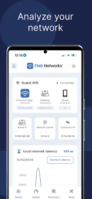 Flair WiFi Analyzer is an application designed to help users solve common network problems such as slow internet speeds, unknown devices using their network, Wi-Fi dead zones, gaming lag, and network connectivity issues. It offers a variety of free network tools, including a Wi-Fi signal analyzer, speed test, latency test, channel scanner, ISP information viewer, and network configuration finder. These tools provide users with valuable information about their network and help them troubleshoot any issues they may be experiencing.