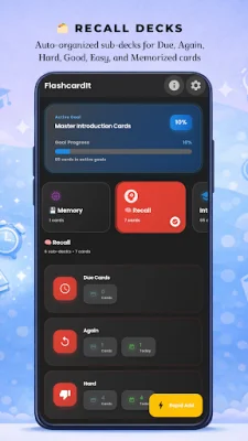 Flashcardit also offers various practice options, including multiple-choice questions (MCQ) and quiz-based flashcards. These features make learning more interactive and engaging, helping you to stay motivated and focused. The app also allows you to organize your flashcards into decks and sub-decks efficiently, making it easier to navigate through your study materials.