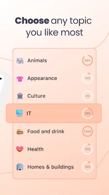 The study app is designed to make learning new English words more enjoyable and engaging through the use of study cards. It is a great tool for both beginners and those who are already learning English. The app offers a variety of features to make the learning process simple and interesting. These include high-quality images, voice recordings, transcriptions, and meanings for each word. The flashcards are conveniently organized into different topics such as family, home, food, and nature. This allows users to focus on specific areas of vocabulary at a time.