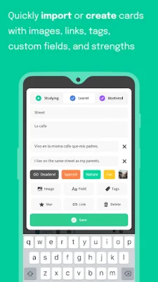This application allows users to create and customize their own flashcards for studying purposes. Users can add images, custom text fields, tags, stars, and links to other cards to make their flashcards more visually appealing and organized. The app also offers a feature called "Spaced Repetition" which helps users study more efficiently by spacing out the review of flashcards over time.