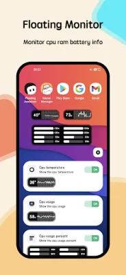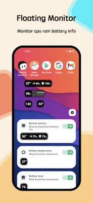 The app also includes a floating monitor that displays real-time information about the device's CPU temperature, battery temperature, and RAM usage. This is particularly useful for gamers who want to keep an eye on their device's performance while playing full-screen games.