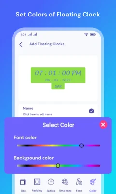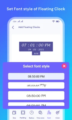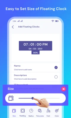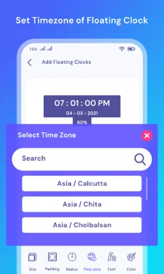 This application allows users to add multiple clocks for different time zones on their screen. These clocks can be customized with different text colors, fonts, and sizes. Users can also choose the background color and adjust the size, padding, and corner radius of the clock. They can also choose between a 12-hour or 24-hour format and add a battery percentage symbol to the clock.