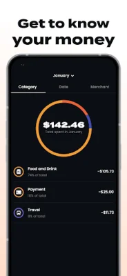 Through the Offers feature, users can find recommendations from partner companies to help them save or make money. The app also provides spending category insights through a handy chart, giving users a quick view of their transactions.