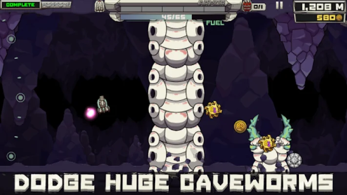 This application offers a variety of features for free, making it accessible to all users. It allows players to become experts through easy-to-learn mechanics that are challenging to master. Each run presents a new challenge with randomly generated missions. Players can upgrade their ship through four research tracks, making it fly like a dream. They can also discover powerups to bomb spaceworms, nuke spaceducks, and blast stalactites. Pre-run powerups can boost the rocket to unimaginable levels of power.
