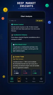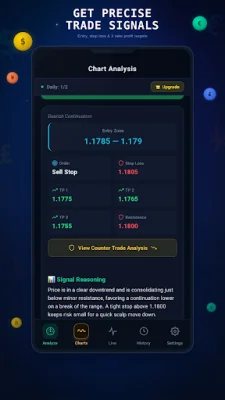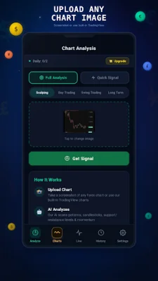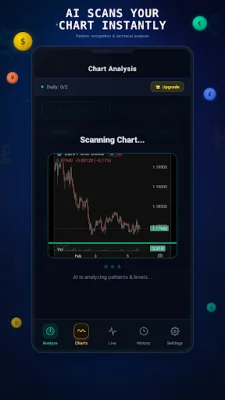 Forex Chart AI is an application that uses advanced artificial intelligence to analyze charts and provide trading insights for major currency pairs. Traders can upload a screenshot from their preferred charting platform and receive detailed technical analysis, including trend direction and strength, key support and resistance zones, and buy/sell signals with entry price, stop loss, and take profit levels. The app supports multiple trading styles, such as scalping, day trading, and swing trading, and provides a confidence percentage for each signal.