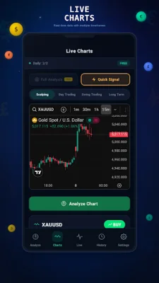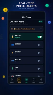 To use the app, traders simply need to open it and navigate to the Charts tab, select their preferred trading pair, adjust the timeframe and indicators, and tap "Analyze." The AI engine will capture the chart and deliver analysis in seconds, including direction, entry, stop loss, take profit, and confidence. Users can also enable live price notifications for real-time tracking.