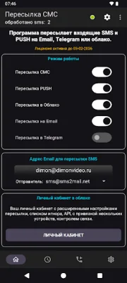 The app only uses SMS messages for forwarding to destinations set by the user. These messages are transmitted securely to https://sms2mail.net for delivery to Email or Telegram. The app does not share, sell, or use messages for advertising purposes. It also does not collect contacts or unrelated personal data.