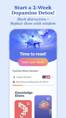 Gone are the days of spending hours choosing and purchasing books on various topics. Fountain's digital library covers a wide range of areas for personal growth and development, including trauma recovery, anxiety and overthinking, productivity and time management, emotional resilience, parenting, health and longevity, relationships, success, and ancient wisdom. Users can access all of this valuable knowledge with just 15 minutes a day.