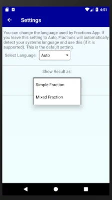 To customize the way the calculator displays results, users can access the settings by clicking on the gear icon. This allows for the selection of how the result is shown on the screen, such as in mixed or simple fractions. This feature can be especially helpful for students who need to show their work in a specific format for their math classes.