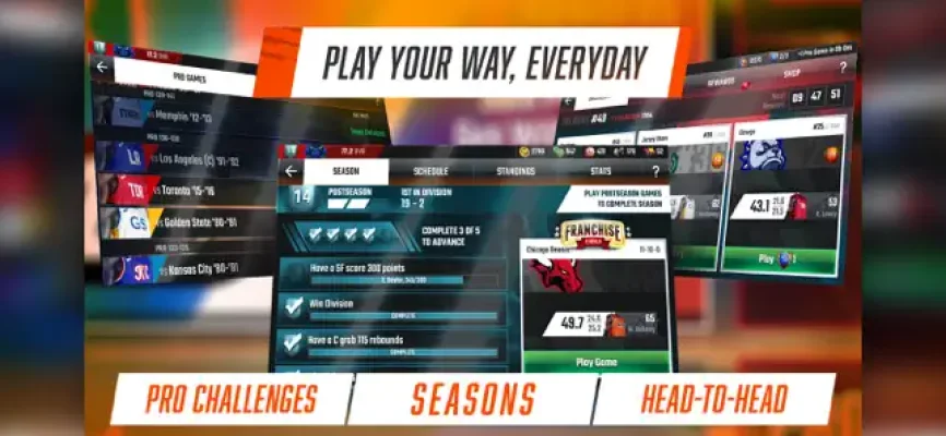 Play Every Day is a mobile basketball game that allows you to play with your team every day. It offers a variety of game modes, including 21-game seasons, exhibitions, pro games, and showdowns. By playing daily, you can earn rewards and draft packs to help you build your franchise. This game is perfect for basketball enthusiasts who want to stay engaged and improve their skills every day.