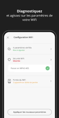 En plus de ces fonctionnalités, l'application vous permet de diagnostiquer et d'agir sur les paramètres de votre WiFi en lançant un diagnostic et en corrigeant les éventuels problèmes en un seul clic.