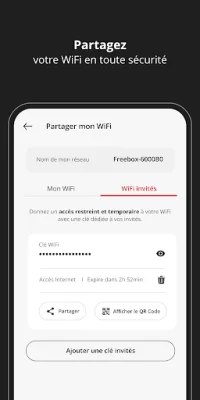 Vous pouvez également partager votre WiFi en toute sécurité avec vos invités grâce à un QR code, sans avoir à leur donner votre clé WiFi. Et pour plus de tranquillité d'esprit, vous pouvez planifier des coupures du WiFi automatiquement la nuit et le réactiver en un clic si besoin.