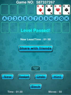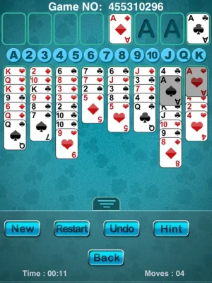 The game is won when all cards are moved to their respective foundation piles. For games with the standard layout, most games are easily solved. FreeCell also offers various supported operations, such as tapping one column and then another to move cards, double tapping on the last card of a column to move it to the buffer area, dragging cards from one column to another, and using the auto-throw feature to automatically throw cards to the recycle pile. Players can also drag cards from the recycle pile back to the columns to restore them.