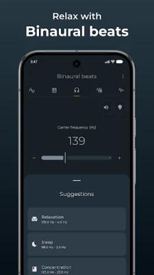 If you are interested in binaural beats for relaxation, sleep, or meditation, this app has a feature specifically for that. You can create and experiment with binaural beats, which are best experienced with headphones. The app also has a sweep generator for frequency sweeps, a noise generator for white noise and other colored noises, and a bass/subwoofers test to test your audio system's low-frequency capabilities.
