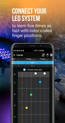 Fret Zealot is a user-friendly guitar learning app designed for those who want to learn guitar at home without the help of a teacher. By installing the app on your smartphone and connecting it to the Fret Zealot LED system, you can display song tabs, chords, scales, and notes directly on your guitar fretboard. The LED strip shows colorized finger positions synced with on-screen instructions, making the learning process up to five times faster. The app also offers video lessons and instructions displayed on the fretboard, allowing you to learn by watching and following along.