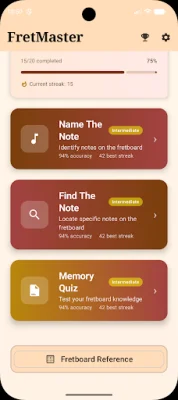 The main goal of FretMaster is to help users solve the puzzle of the fretboard. It removes the confusion of note identification and replaces rote memorization with interactive exercises that build muscle memory, visual recognition, and instant recall. These are the skills that truly transfer to real playing and can help users become more confident and versatile musicians.