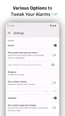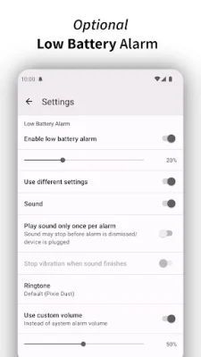 This application aims to help users save power and electricity by preventing unnecessary charging of their devices. It offers a new optional beta feature, a low battery alarm/charge reminder, which can be turned on in the settings. This feature helps users charge their devices on time. However, users of Huawei, OnePlus, Xiaomi, or Meizu devices may need to follow specific instructions to prevent any issues with the app or alarm. The app allows for customization of the alarm, including the ringtone and vibration settings. It is designed with simplicity in mind, making it easy for anyone to use. To use the app, simply open it, enable the alarm, and adjust the settings as desired. Some of the key features of this app include helping users unplug their devices on time, a new optional bonus feature of a low battery alarm/charge reminder, the ability to set a custom alarm ringtone, and the option to enable or disable vibration for the alarms. The app also has a clean and simple user interface, is fast and lightweight, and does not have any unnecessary features or bloat. Overall, this app is free to use and aims to be original and SEO-oriented. It is designed to be user-friendly and help users take care of their devices while also saving power and electricity.
