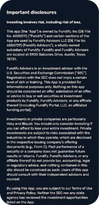 However, it's important to note that investing in private companies is risky and illiquid. Fundify advises that you should only invest if you can afford to lose your entire investment. They also disclose the risks associated with the industries in which the startups operate in their offering documents. Past performance does not guarantee future results, and Fundify does not provide tax, accounting, legal, or regulatory advice. It's recommended that users consult with their independent advisors and counsel before making any investment decisions.