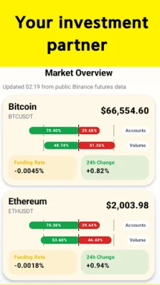 The home screen of the app also displays live public futures market information for BTC and ETH. This includes the current price, funding rate, and long vs short ratio for both cryptocurrencies. This real-time market data can help traders stay updated and make timely decisions.