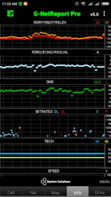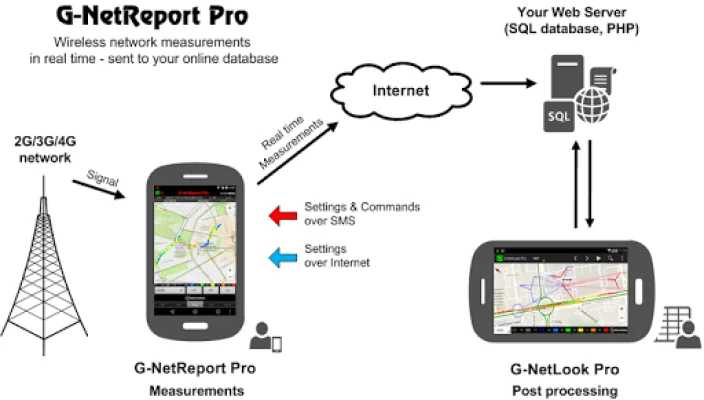 G-NetReport Pro is a mobile application that allows users to collect and organize data from their measurement fleet of reporting phones. It is similar to G-NetTrack Pro, but with the added feature of being able to send online reports to a user's own database. This allows for easier post-processing of measurements using G-NetLook Pro. The app is available for Android devices and requires users to have location services turned on for it to function properly.