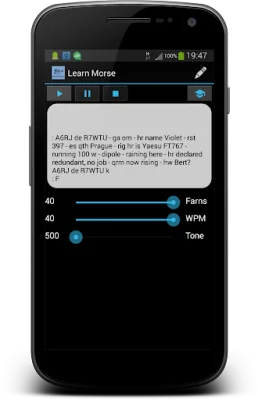 The default character introduction sequence is 'Cunningham', but users can easily switch to the 'Koch' method through the menu. The app also offers a listen mode, where users can practice reading morse code. It includes built-in text files, a random text generator, and a sample QSO generator for added fun and variety.