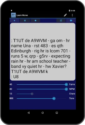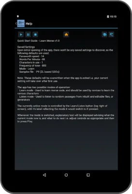 In summary, this application is a teaching program that helps users learn morse code through incremental learning of individual sounds. It offers a listen mode for practice and includes built-in text files and generators for added fun. Help text is available through the menu, and the app is based on the concepts of the PC-based "Teach" software. Users can also join the Facebook group for additional support and resources.