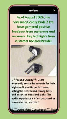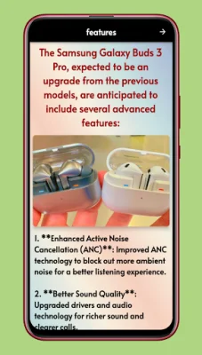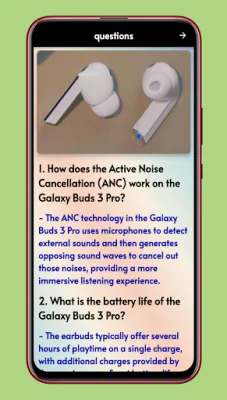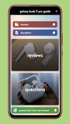 Some of the features of our galaxy buds 3 pro guide app include an easy-to-follow guide, a visually appealing interface, and a wealth of information. You can find details about the features of the galaxy buds 3 pro, a description of the device, customer reviews, and answers to common questions.