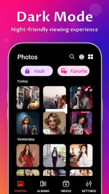 For those who prefer a professional and battery-saving interface, the app also offers a dark mode gallery for night use. This modern design is perfect for users who want a stylish and functional gallery app.