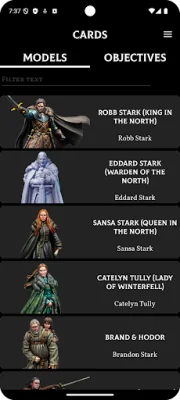 This application allows users to easily access and view the abilities and statistics of their characters through character cards. These cards provide a quick and convenient way to keep track of important information during gameplay. Additionally, users can also view objective cards, which provide further details and objectives for the game.