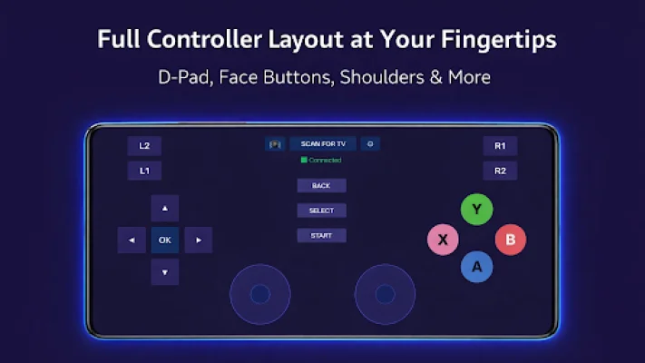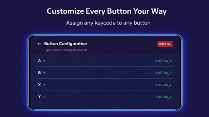 The app features a D-Pad with slide detection, allowing you to smoothly navigate by sliding your thumb. It also includes PlayStation-style face buttons (A, B, X, Y), shoulder buttons (L1, L2, R1, R2), dual analog joysticks, and select, start, and back buttons. These buttons also provide haptic feedback when pressed. Additionally, the app allows for customizable button mapping, meaning you can assign any keycode to any button according to your preferences.