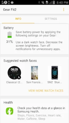 The app requires certain permissions in order to function properly. For optional permissions, the app's default features will still work, but users will not be able to access certain functions. The required permissions include Location, which is used to search for nearby devices through Bluetooth, and Storage, which allows for the transmission and receipt of files with the Gear device.