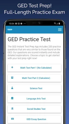 One of the key features of our app is the full-length practice tests for both sections of the GED® Math test. This includes both the Calculator Allowed and No-Calculator Allowed sections, ensuring that you are fully prepared for all aspects of the test. In addition, our app also includes a complete guide for the GED® Language Arts Essay, along with a practice essay question and a high-scoring sample response. This is essential for mastering this important component of the test.