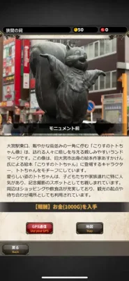GPS通信機能を使用すると、指定された場所を実際に訪れることで、その場所ごとに決められた特典を得ることができます。例えば、こりすのトトちゃん像を訪れるとお金1000Gを入手できたり、大宮門街を訪れると戦士が仲間になったりします。また、この機能では位置情報を取得するため、端末の設定で本アプリ使用時の位置情報利用を許可する必要がありますが、バックグラウンドで位置情報を取得することはありません。