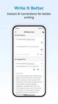 In addition to speaking and listening, the German Ai App also helps users improve their writing skills. The app has an AI grammar correction tool that provides instant and accurate feedback on writing grammar. This feature is beneficial for anyone looking to improve their overall German language proficiency.
