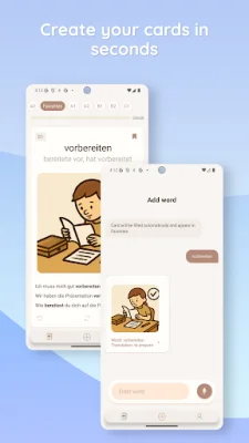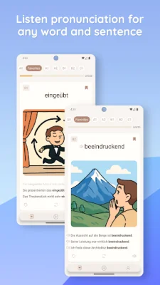 This application is a language learning tool that offers thousands of word cards with images, example sentences, and clear explanations. It also has a voice input feature where users can type or dictate a word and get a ready-to-use learning card in seconds. The app also provides native pronunciation, allowing users to tap on any word or sentence to hear it spoken. This can be helpful for improving pronunciation and understanding of the language.