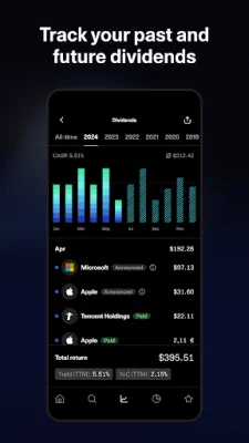 Our investment and wealth tracker is a user-friendly finance application that allows you to easily manage and track your entire investment portfolio. It is a comprehensive tool that helps you monitor your progress, view your overall net worth, and make informed decisions for your financial future. With our wealth tracker, you can take control of your finances by tracking all of your investments in one place. This includes stocks, ETFs, real estate, luxury collectibles, art, and commodities, which can all be visualized on a single dashboard. You can also keep track of your aggregated net worth in real-time, no matter where you are. In addition to tracking your investments, our app also provides you with all the financial information you need in one convenient location. This includes news and alerts to help you stay up-to-date and make informed decisions. Our real-time investment tracker makes managing your investments effortless. You can also use our personalized dividend tracker to plan future cash flows, find the best dividend stocks, and track your dividend performance in one dashboard. Our portfolio and dividend trackers also offer intuitive analysis tools to help you make informed decisions. You can see detailed breakdowns of your portfolio by region, industry, and asset class, as well as other key performance indicators. This allows you to easily identify areas where your money is growing and where it may need some attention. In addition to these features, our app also offers a community aspect where you can connect with other investors, ask questions, and get feedback on your portfolio and trades. You can also join themed discussions, share your portfolio, and discover new investment ideas before they become mainstream. We take the security of your data seriously and ensure that all of your personal and financial information is stored with bank-level encryption. We do not access or store any of your data without your consent, giving you peace of mind that your information is safe with us.